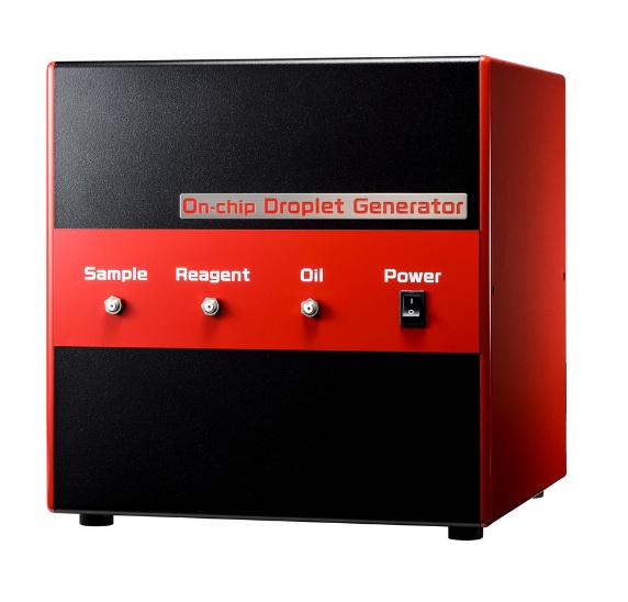 On-chip Droplet Generator allows mass production of micrometre-sized water-in-oil (W/O) emulsion droplets and gel microdrops (GMDs) with a unique microfluidic chip. The individual droplets function as miniaturised vessels for reactions such as microbial/cell cultivation and genetic analysis. Droplet technology is now recognised as a prominent high-throughput screening method allowing single cell analysis or simultaneous assay of more than 1 million samples.